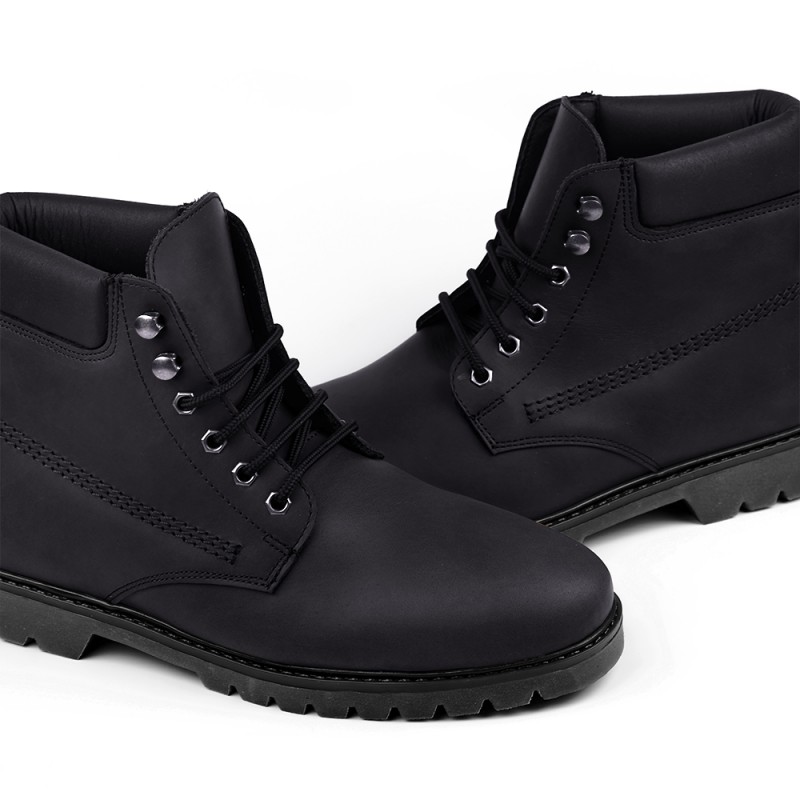 Montana. Botas para aumentar a sua altura . Montana é uma bota com cadarço confeccionada com o melhor couro e possui tratamento Scotchgard da marca 3M que repele a água. Possui sola de borracha flexível, resistente e aderente que o torna ideal para excursões. Destaca-se pelo seu design simples e durabilidade. Recomenda-se limpar estes sapatos com uma escova macia de camurça e nobuck sem água para evitar espalhar manchas.